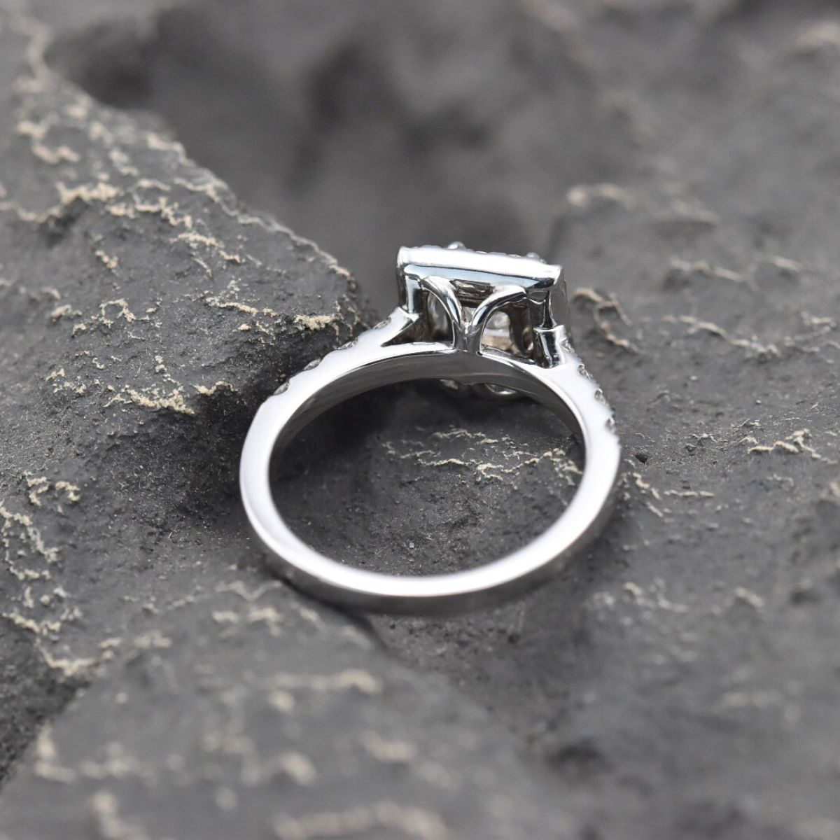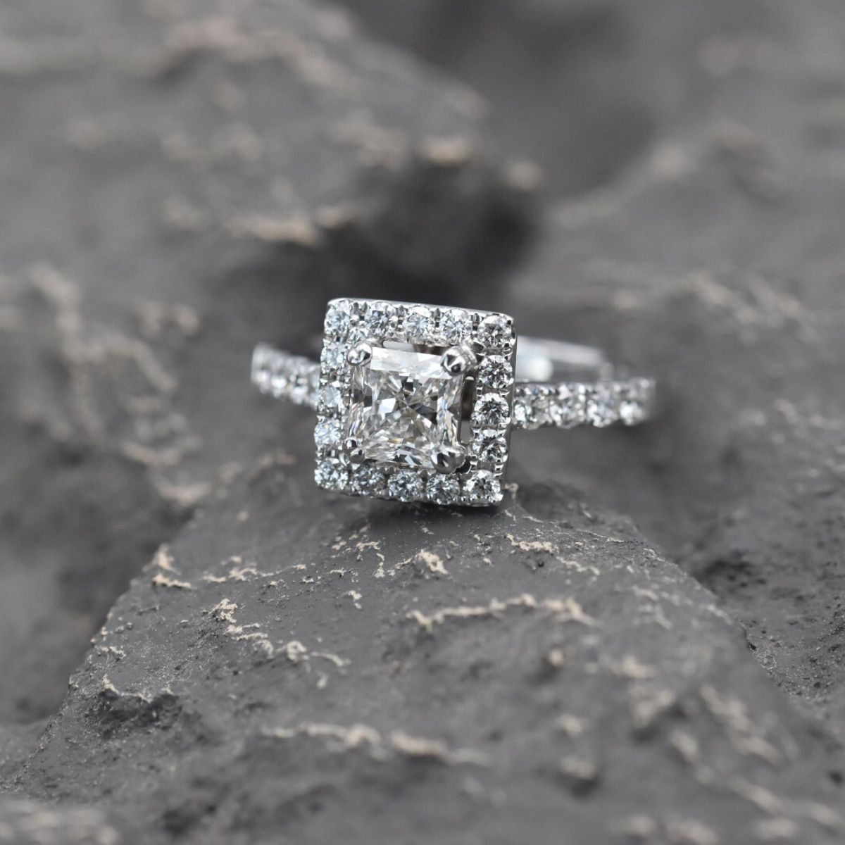 Round cut solitaire set in an 18k white gold diamond set mount, with square halo and diamond shoulders