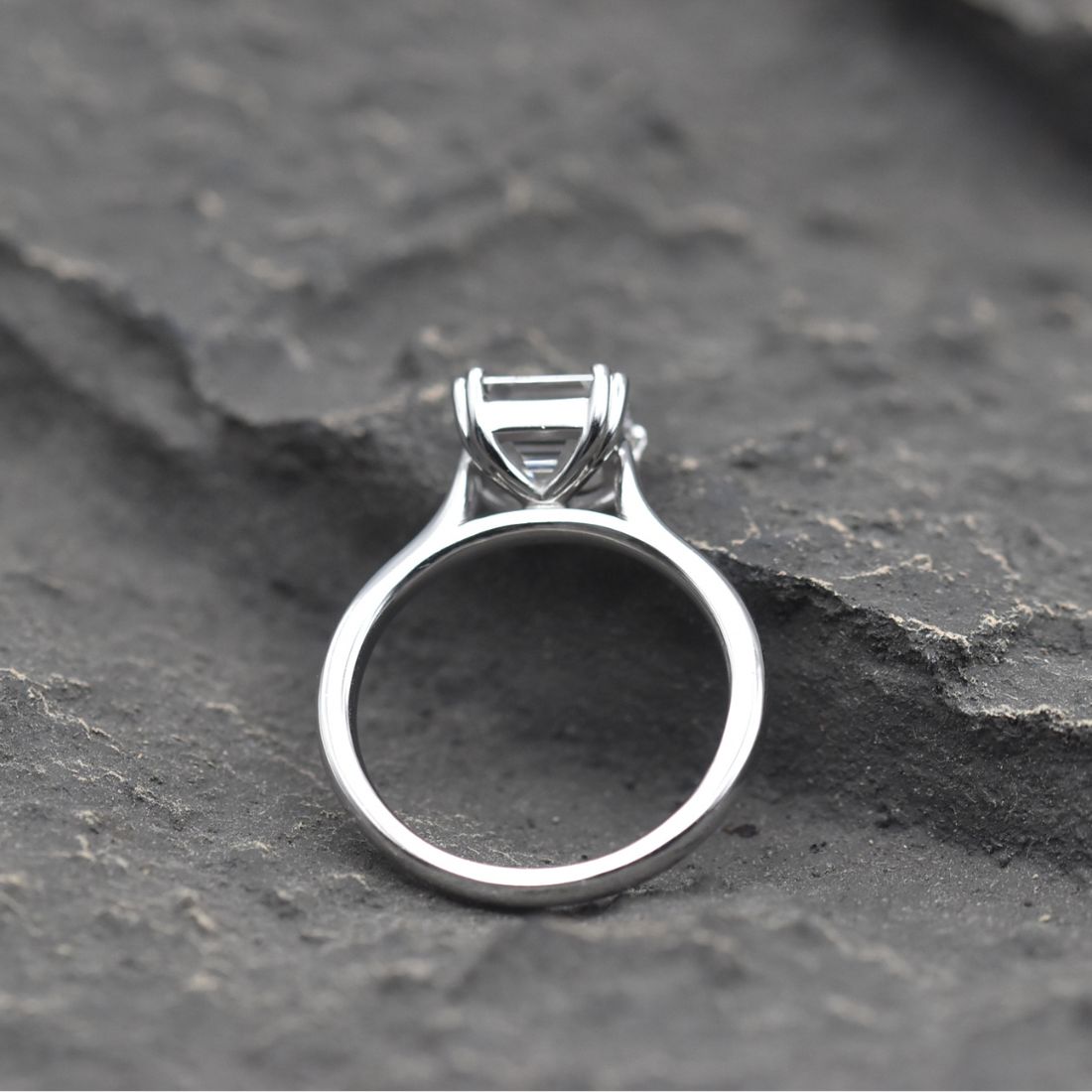 Asscher cut diamond set in 18k white gold with 2.10ct centre stone, E Colour, VS2 Clarity on a GIA Certificate.
