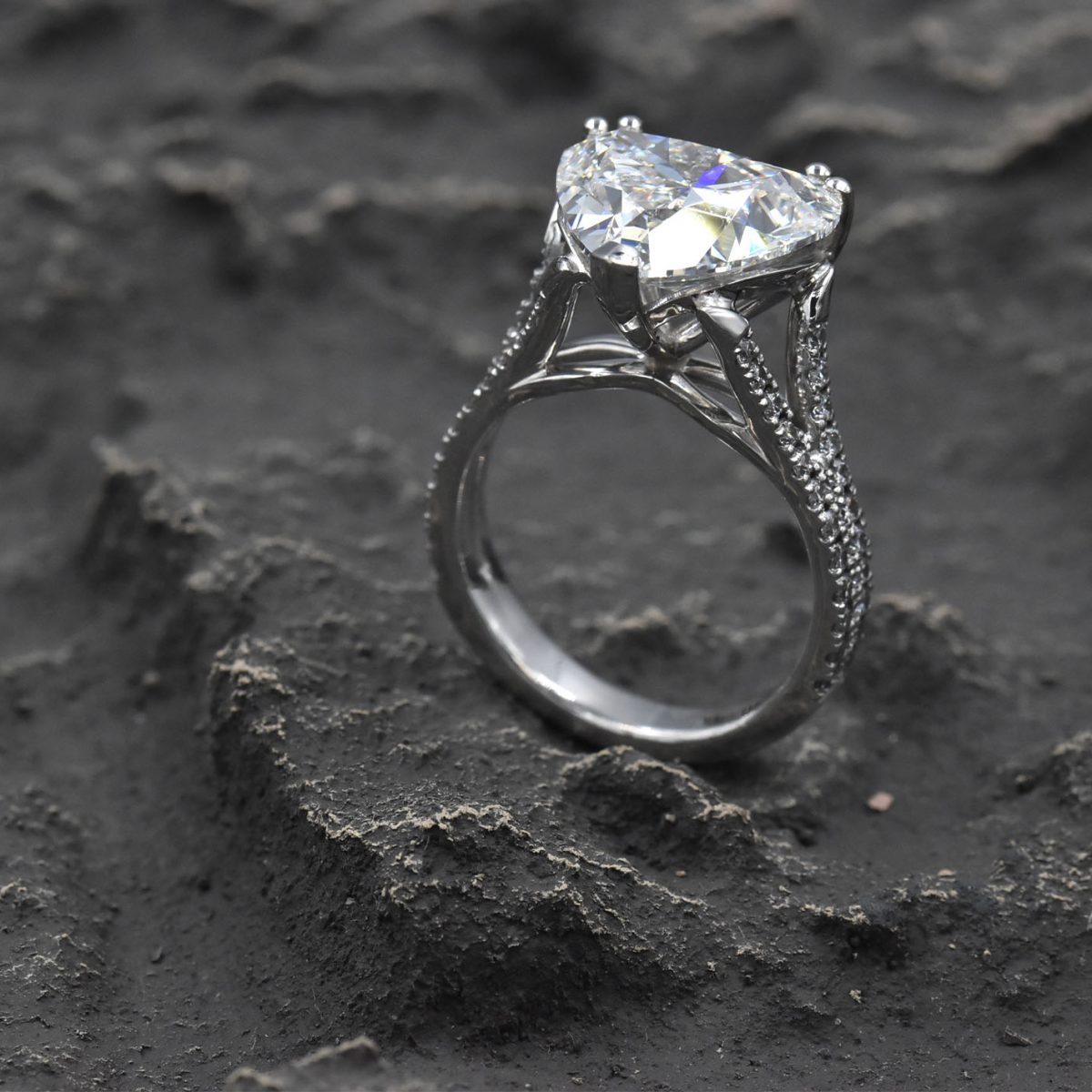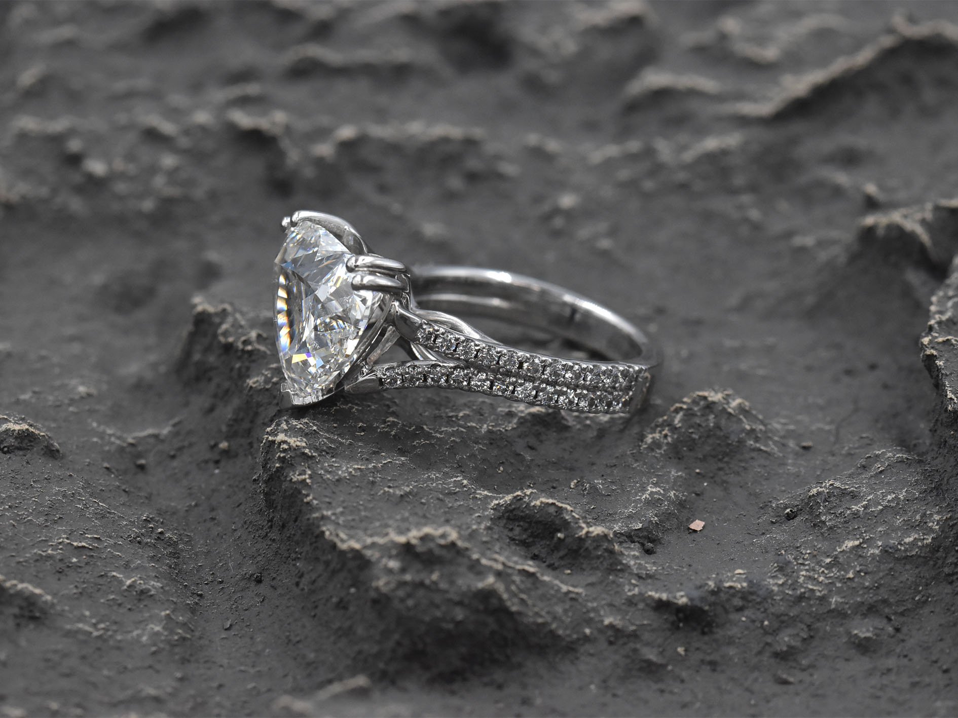 Heart cut diamond solitaire ring set in 18k white gold with 2 rows of diamonds set down each side, 4.56ct I Colour SI2 Clarity on a GIA Certificate.