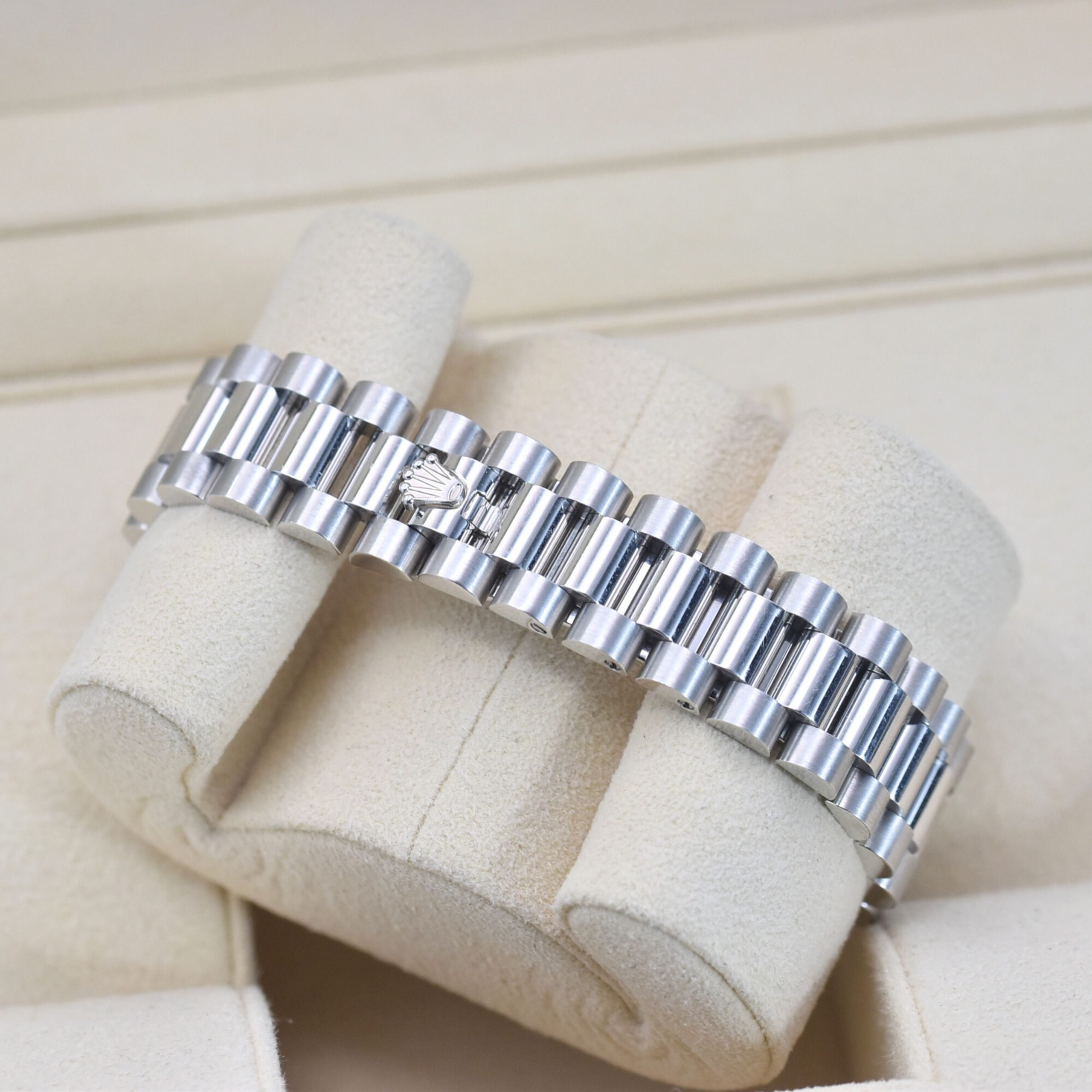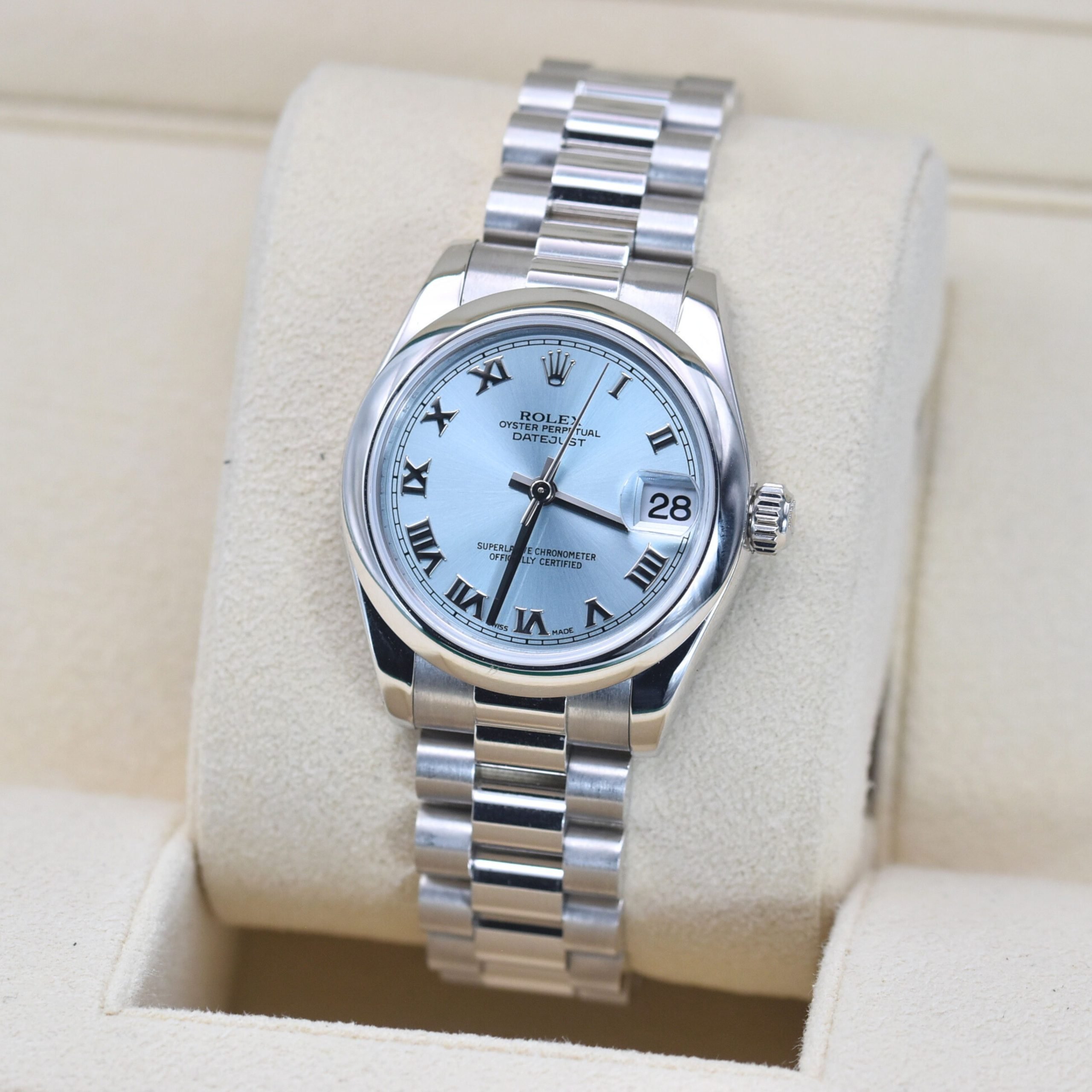 Experience ultimate luxury with the Rolex Datejust 31mm Ref. 178246, crafted in platinum and featuring a striking ice blue dial. Paired with the elegant President bracelet, this 2011 model exudes sophistication and timeless Rolex craftsmanship.