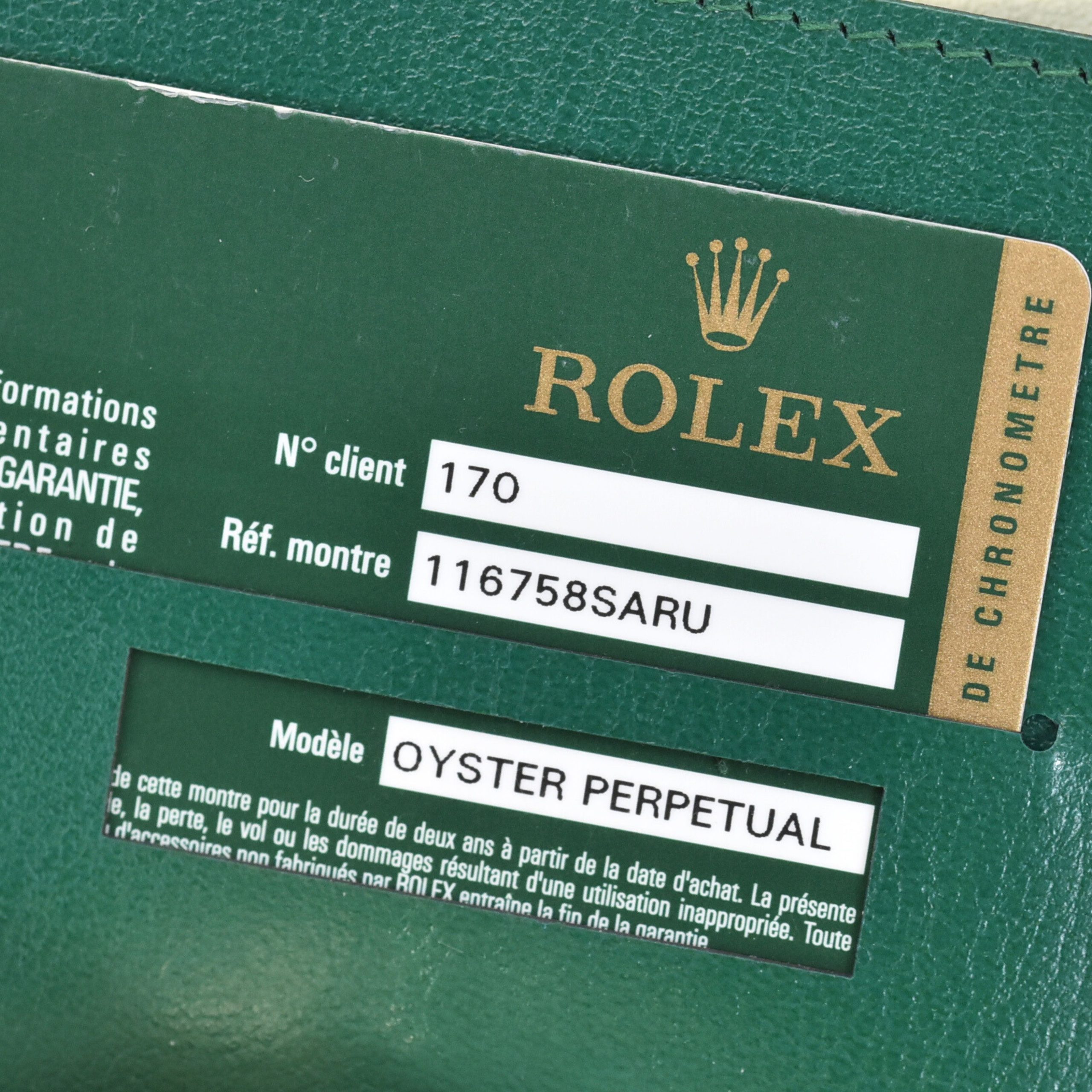 This 2016 example comes complete with its original box and papers, ensuring authenticity and desirability for discerning collectors. Available exclusively at Rockefellers Jewellers today, this rare 116758SARU presents an extraordinary opportunity to own a highly coveted gemstone Rolex in pristine condition—an unmistakable centerpiece for any luxury watch collection.