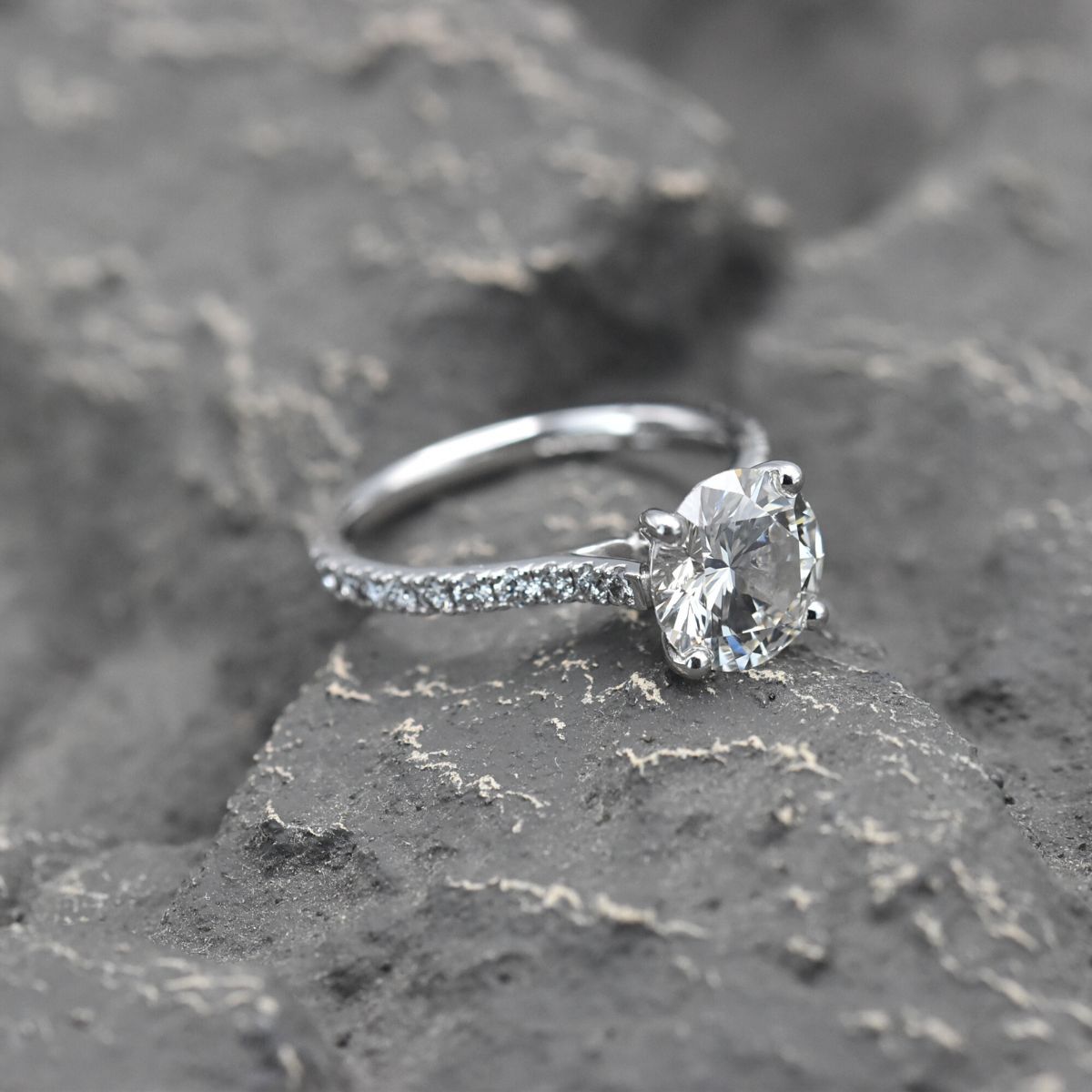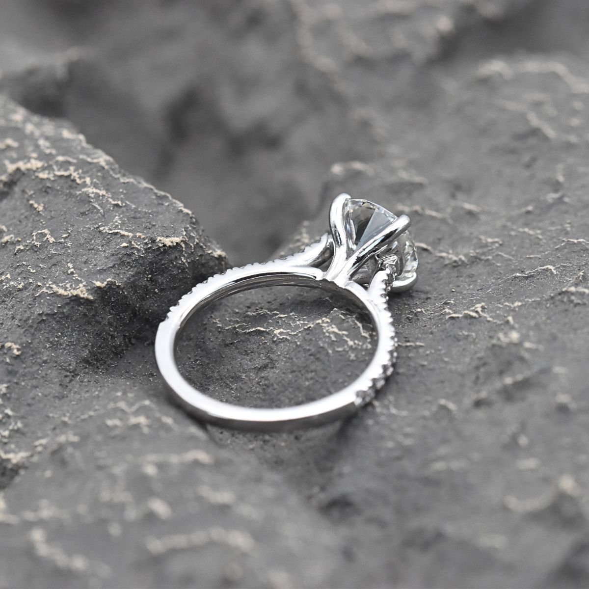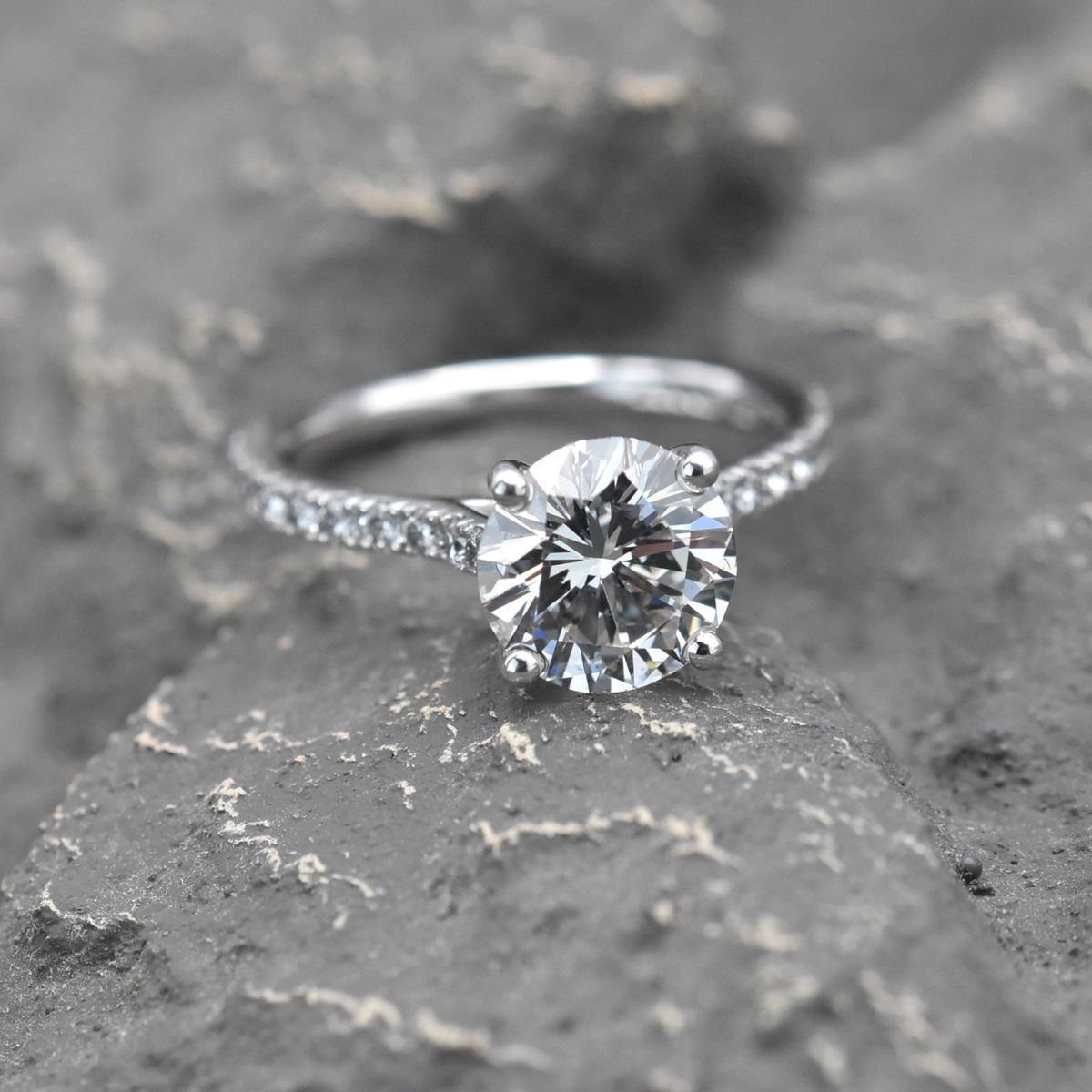 Round cut diamond solitaire set in 18k white gold with diamond shoulders.  Diamond weight 2.30ct H Colour VS2 Clarity on GIA certificate.